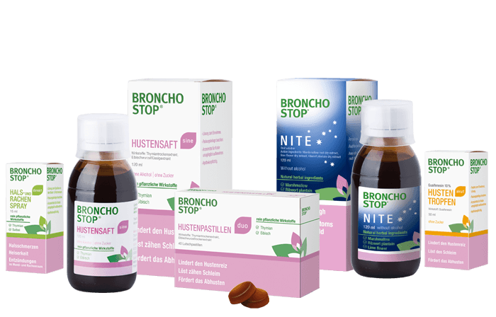 Bronchostop® Sine & Bronchostop® Syrup contain the purely herbal active ingredients thyme & marshmallow.